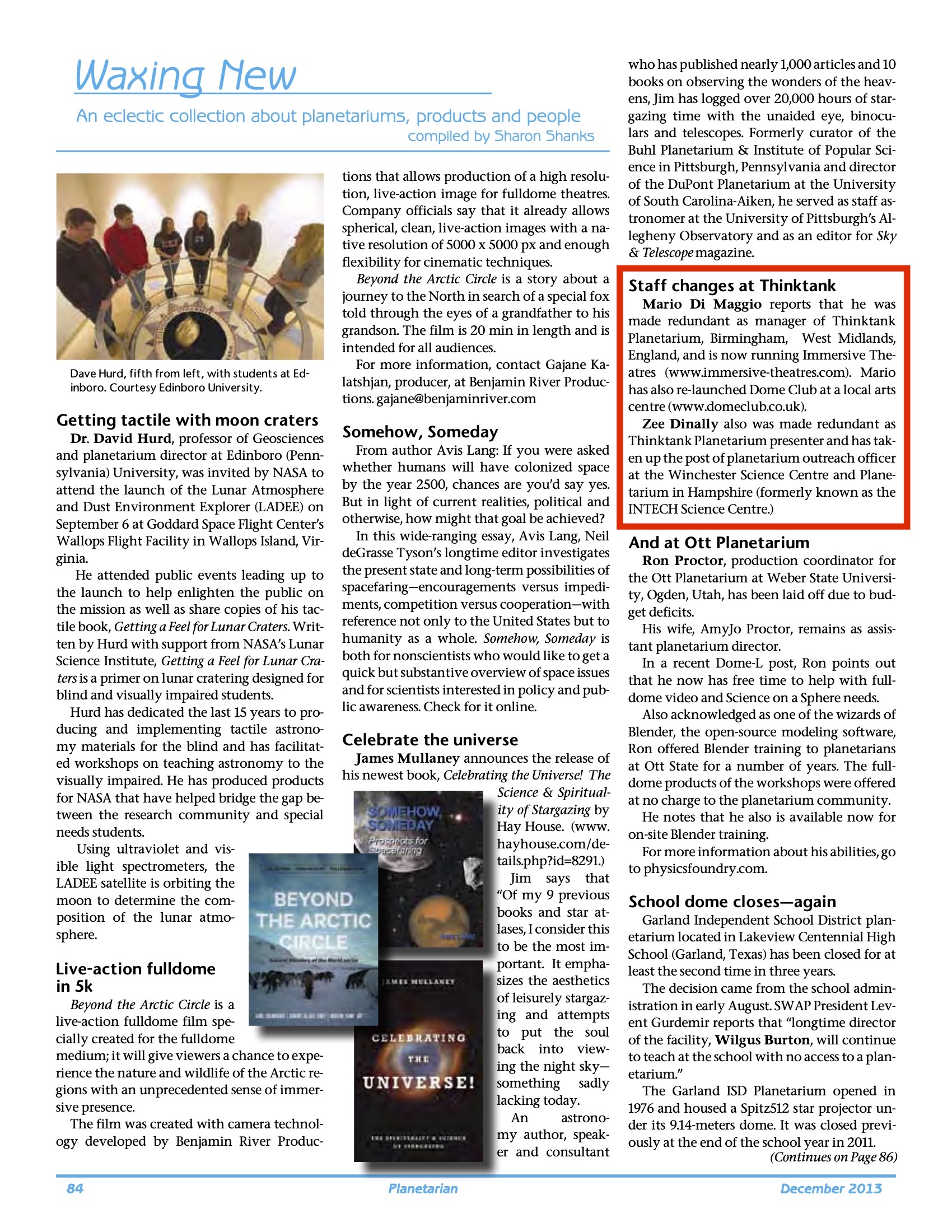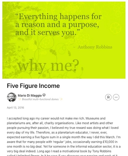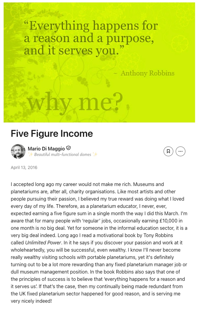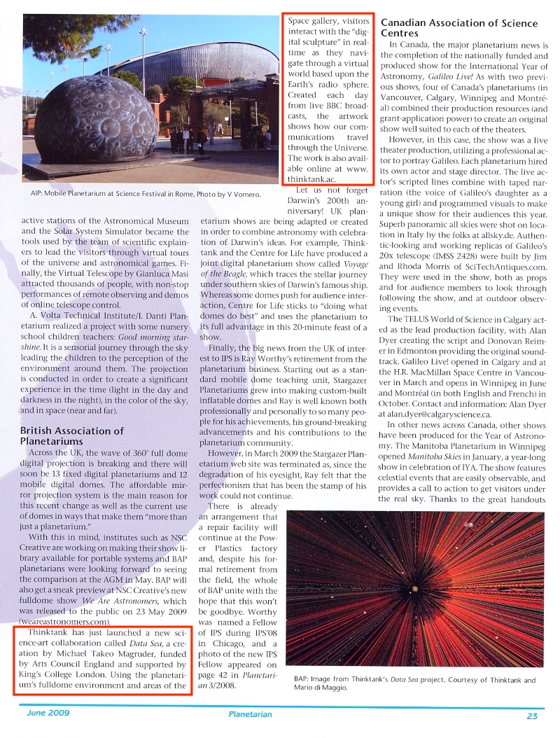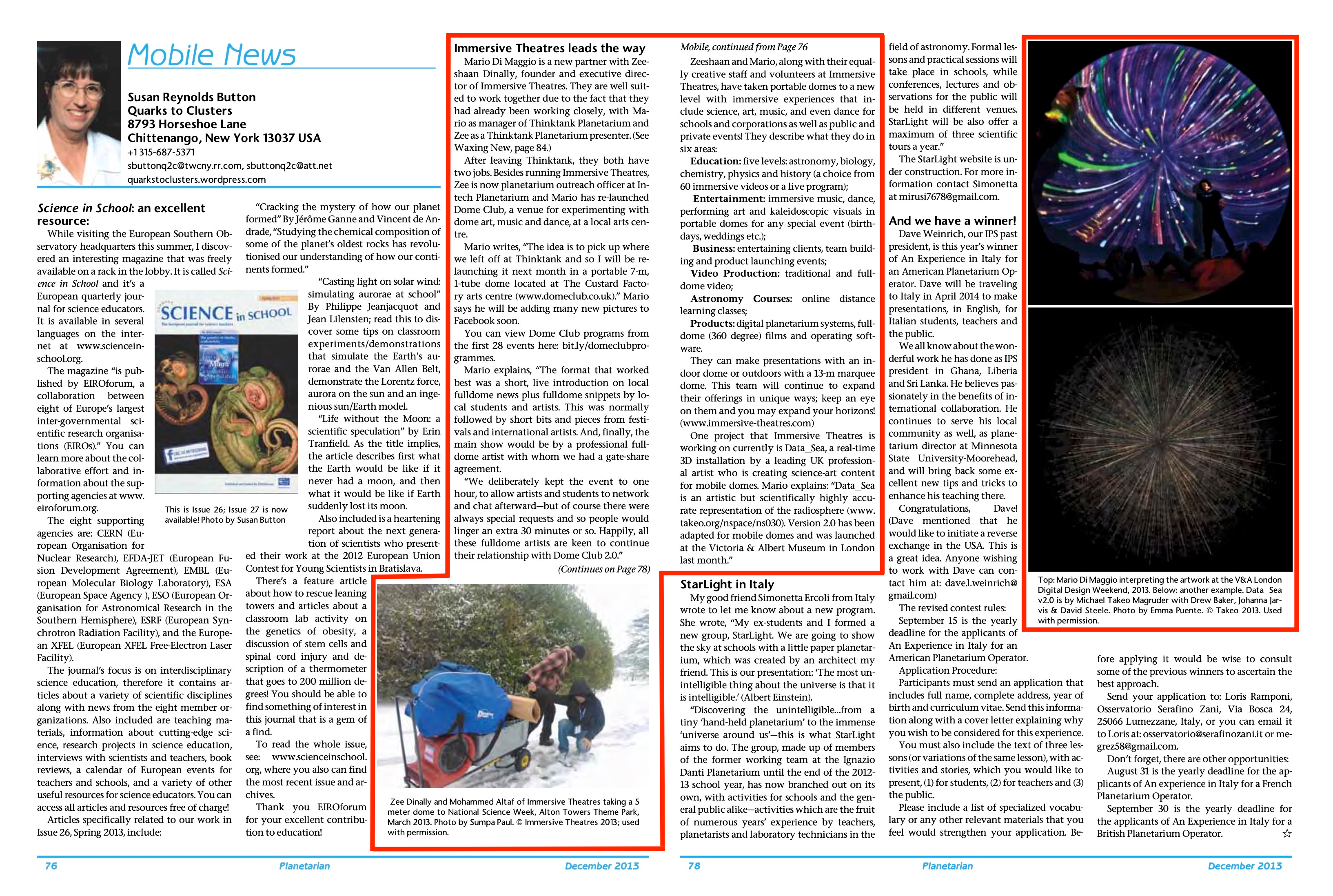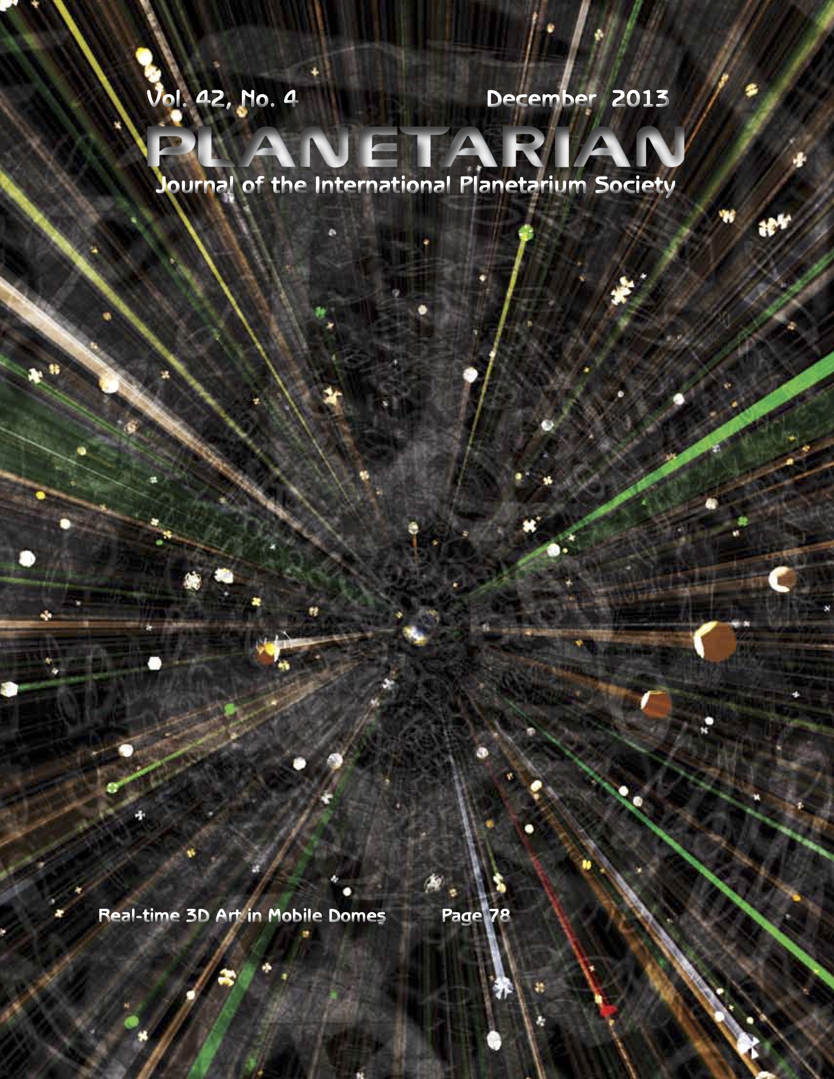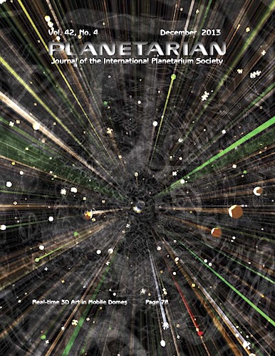 After taking the reins at Immersive Theatres, a unique collaborative mobile dome art project of Mario's appeared on the cover of the December 2013 issue of The Planetarian (described on pages 77-78)
