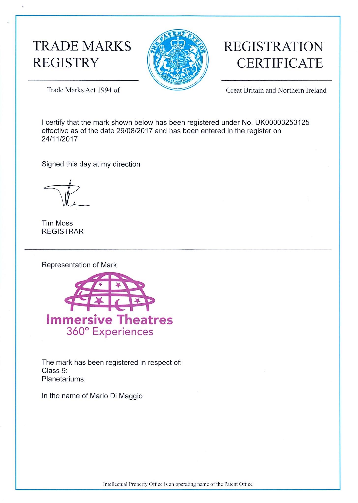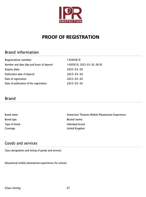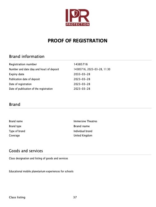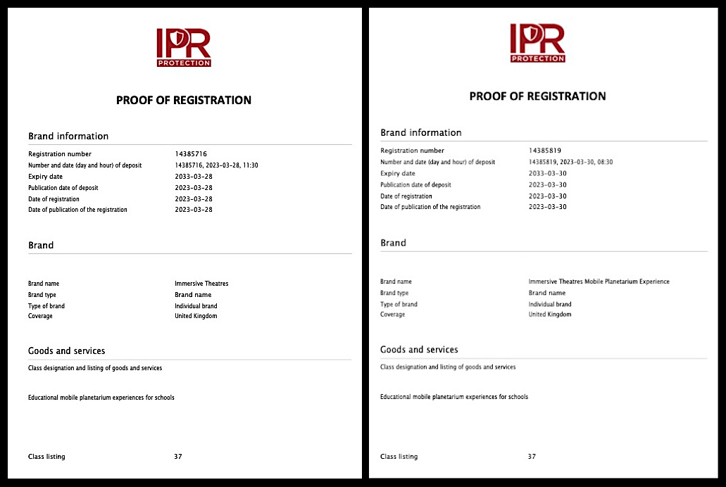 Despite having trademark registered our logo in November 2017 (which includes our name Immersive Theatres); an unethical mobile dome competitor attempted to trademark register our well-established business name Immersive Theatres, as well as the variation Immersive Theatres Mobile Planetarium Experience.