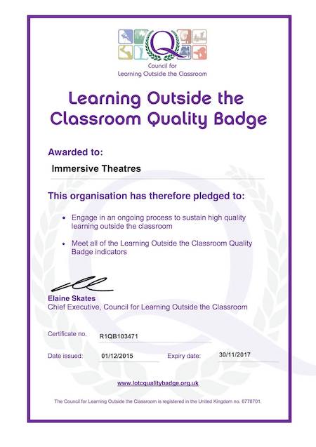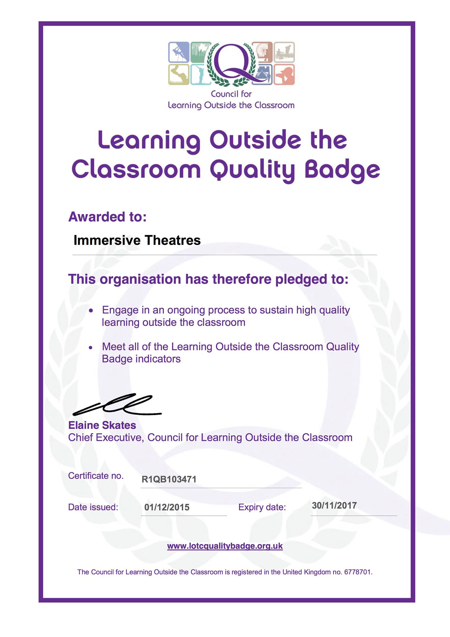 On 1st December 2015 Immersive Theatres became the first UK mobile planetarium provider to receive the UK government's Learning Outside the Classroom Quality Badge.