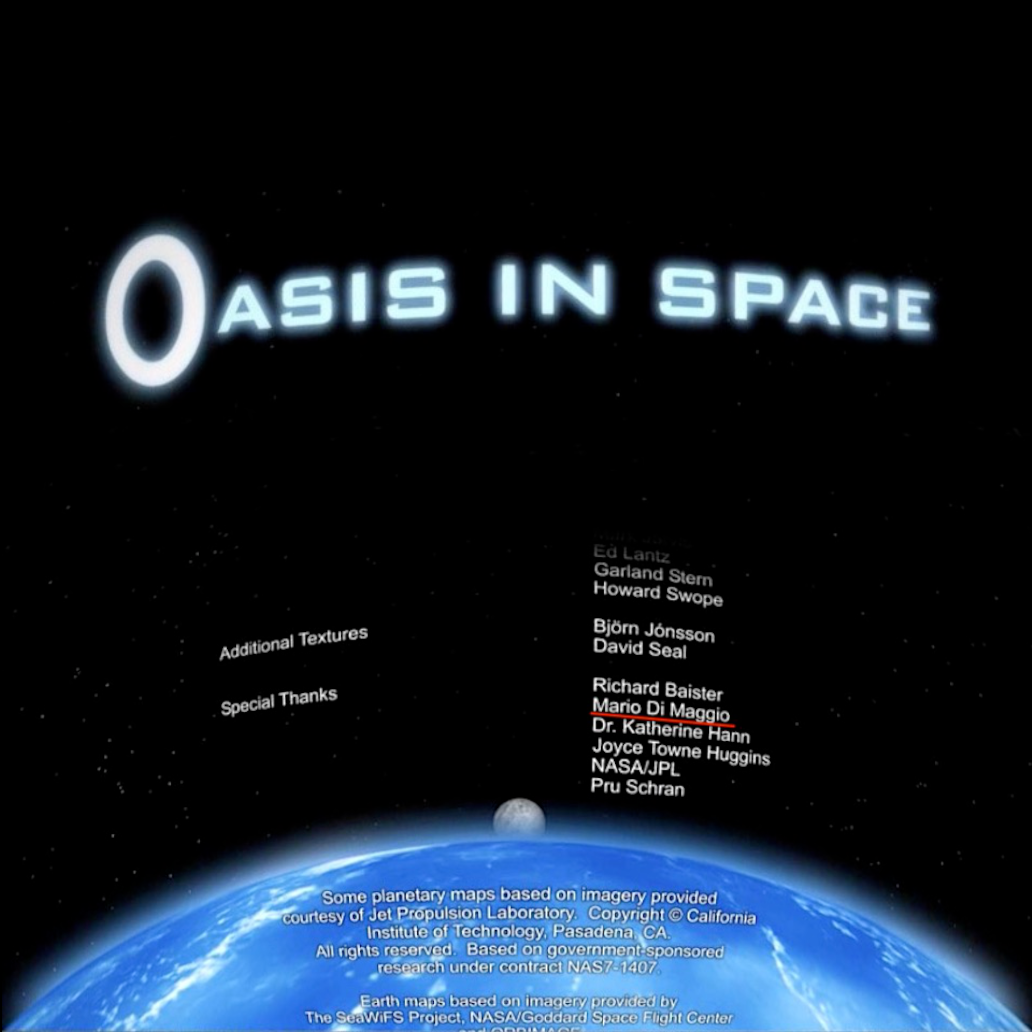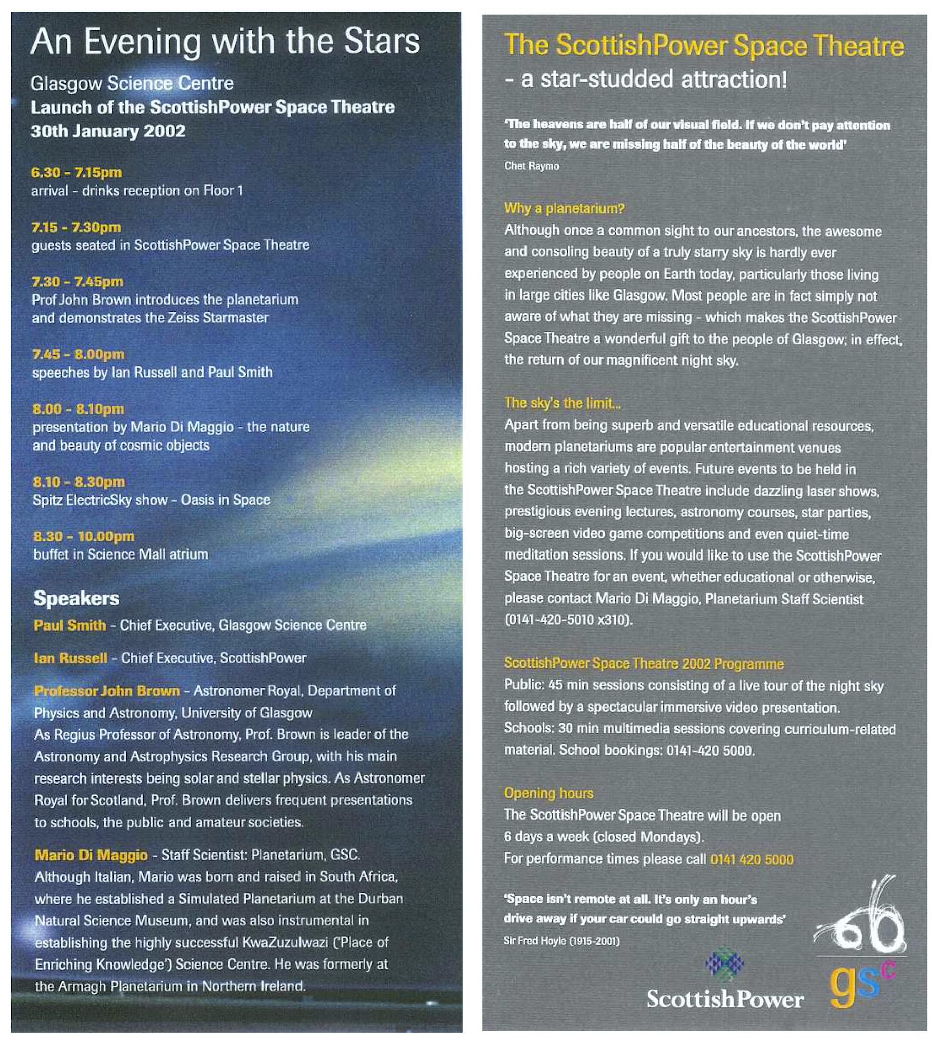 Oasis in Space world-premiered at the opening of the Glasgow Science Centre planetarium (originally named the ScottishPower Space Theatre) on 30th January 2002, where Mario was the planetarium's first manager.