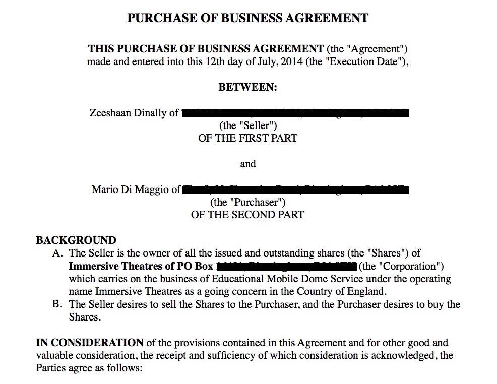 On 12 July 2014 Zee Dinally (while still employed at Winchester Planetarium) sold Immersive Theatres to Mario Di Maggio for the equivalent of £3,000. The sale did not include equipment (assets) but only the business name and branding (shares).