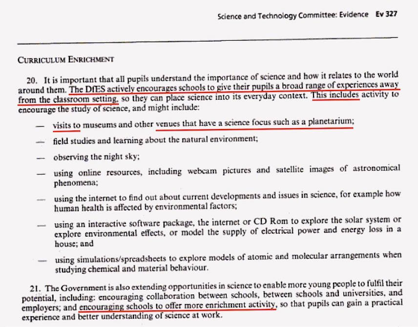 State science and technology education committees actively encourage schools to provide students with enriching planetarium experiences.